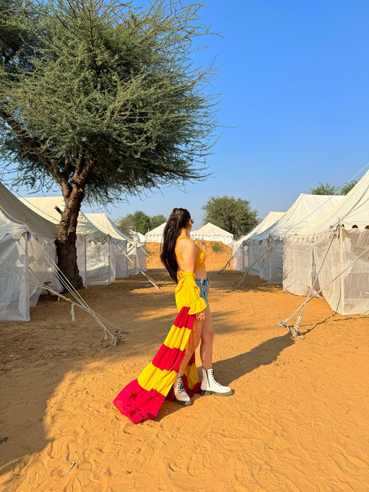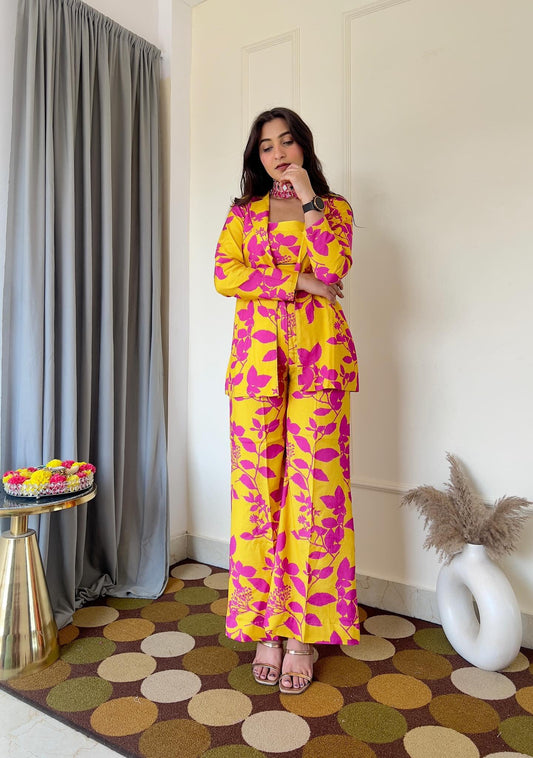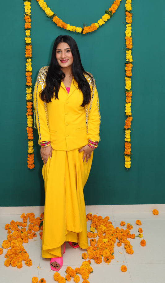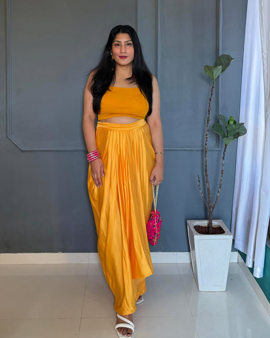 Yellow Co-ord Set with Mirror Work With Dhoti Drape SKIRT (2 Piece)