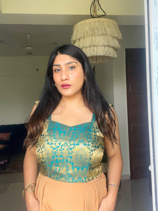 Royal Green Drape Dhoti Skirt With Oversized Shellwork Top