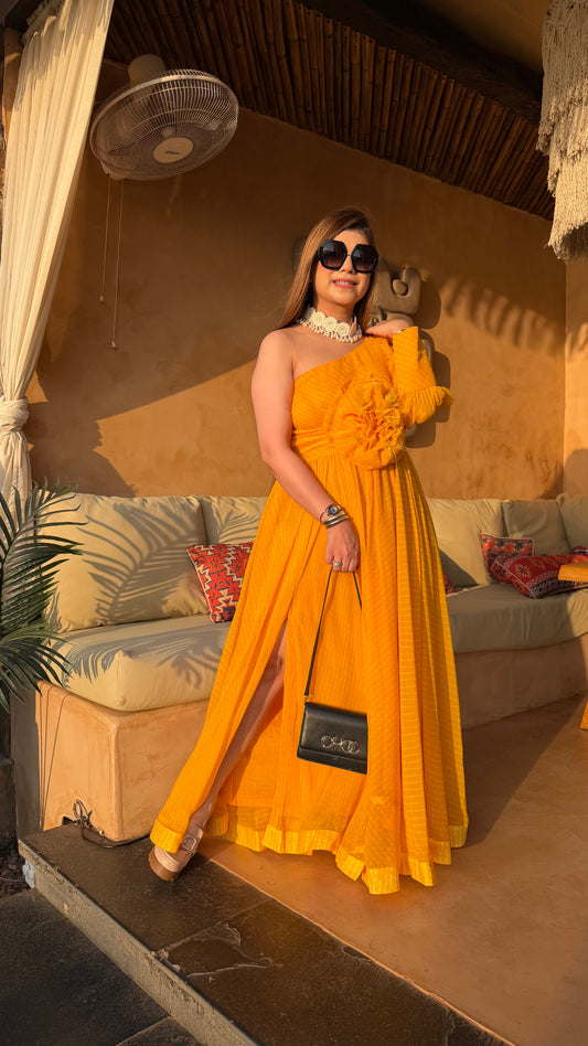 Sun-Kissed Leheriya One-Shoulder Maxi Dress