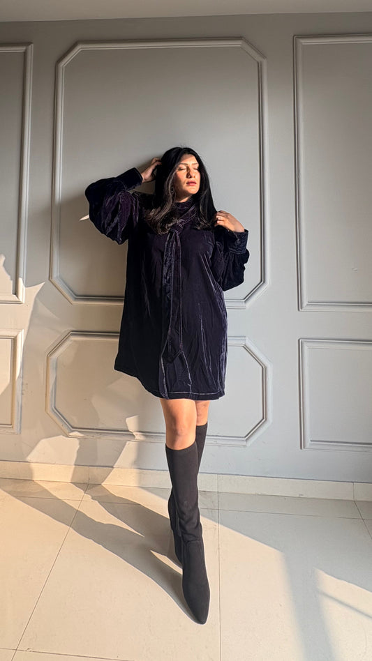 Velvet Tie-Neck Winter Dress for Women