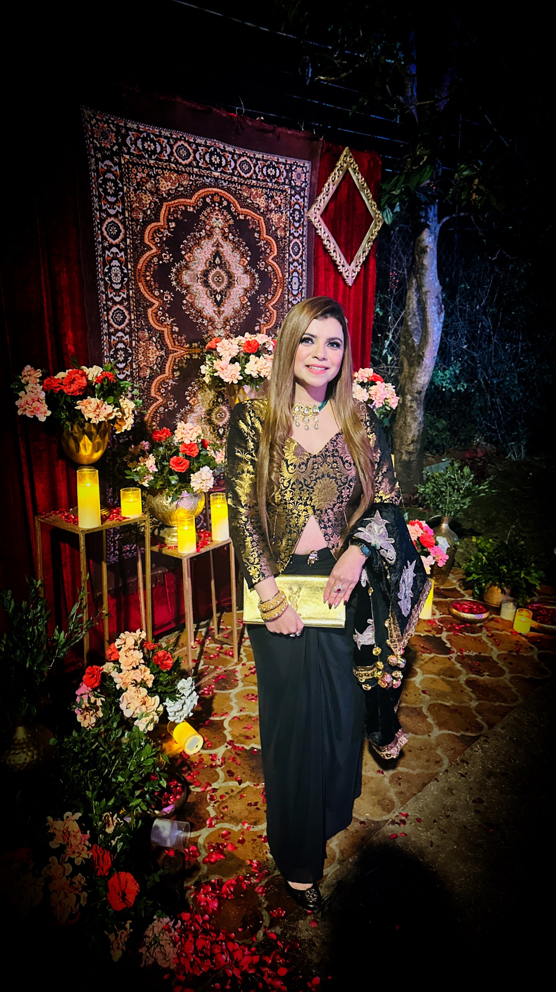 The ensemble features a luxurious gold brocade blouse with intricate woven motifs and a flattering V-neckline that enhances the waist and neckline beautifully. It is paired with a fluid black drape skirt, designed to fall gracefully while creating movement, structure, and elegance with every step.