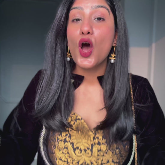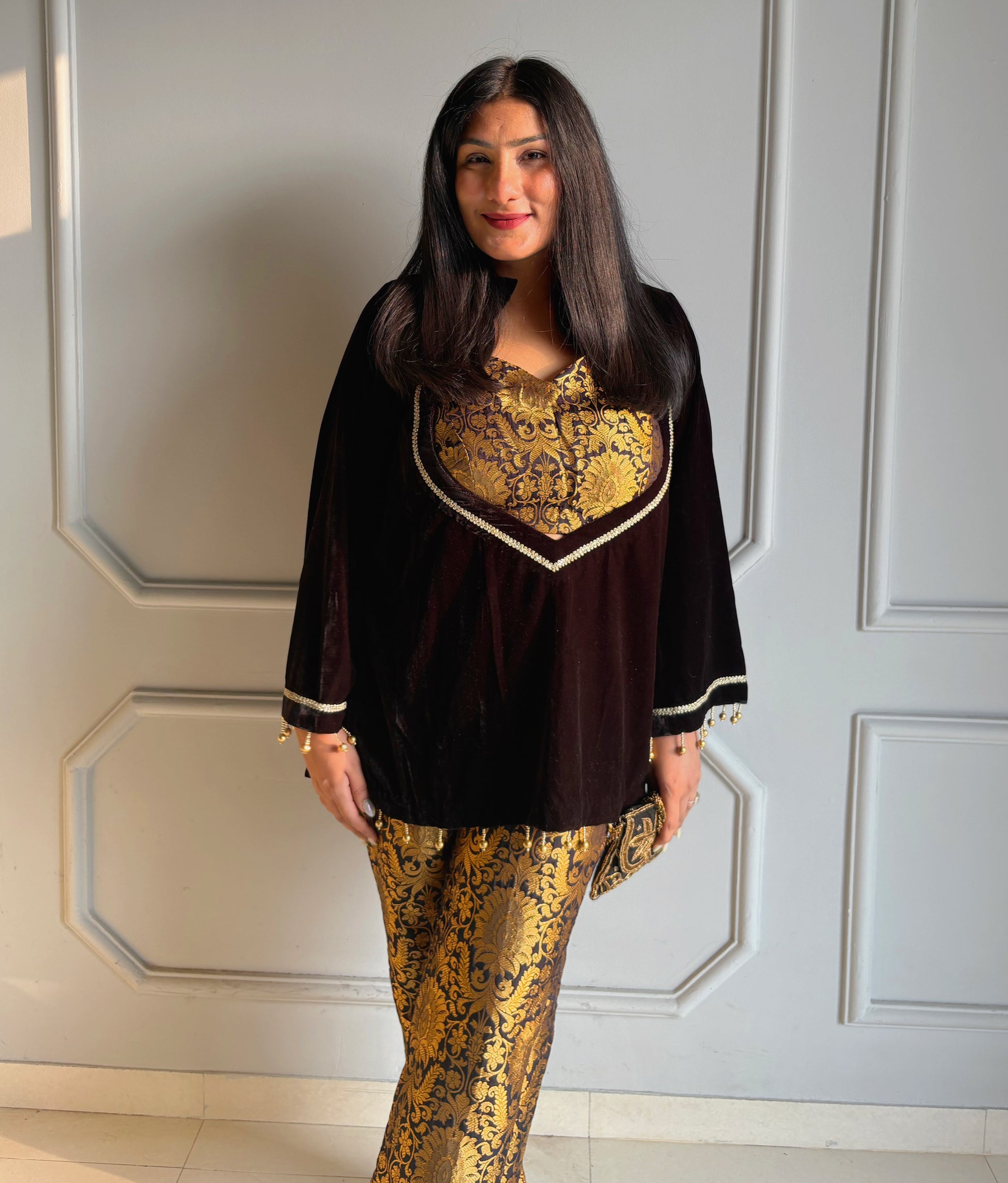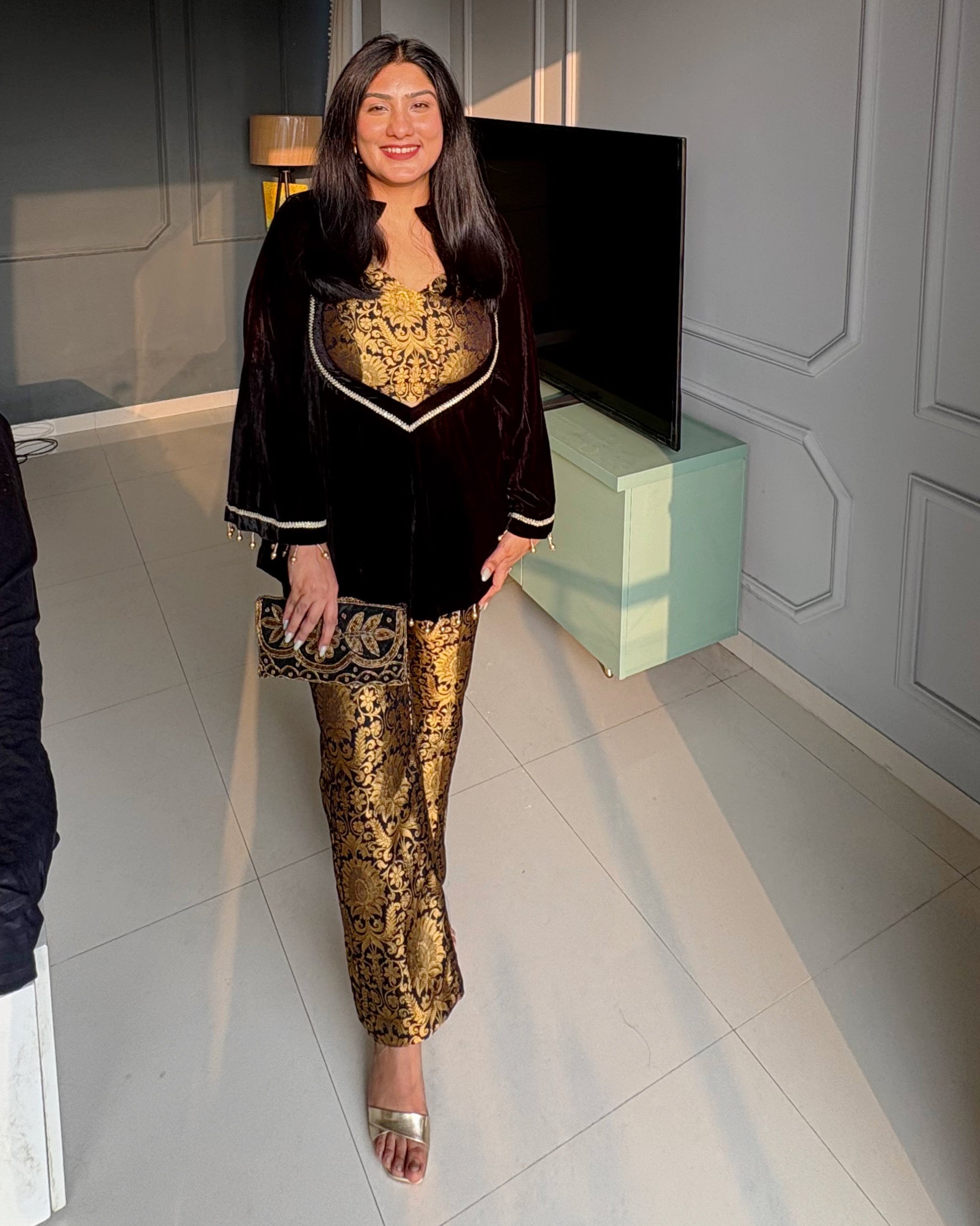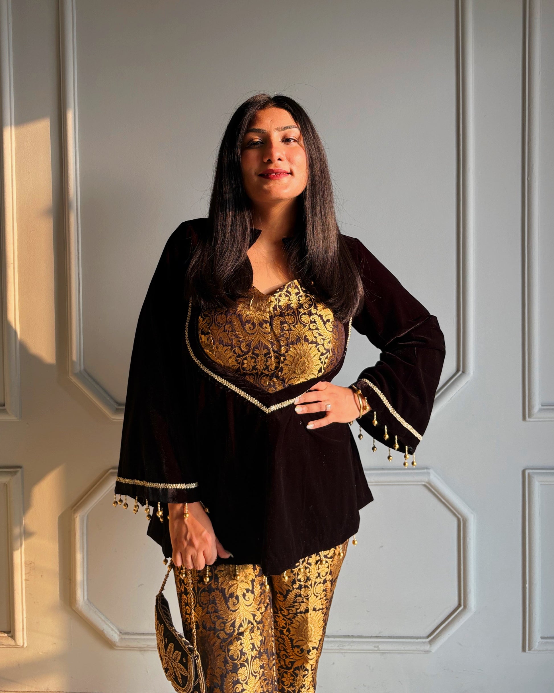 A timeless black kurta paired with rich gold brocade pants, crafted for moments that call for quiet elegance.
