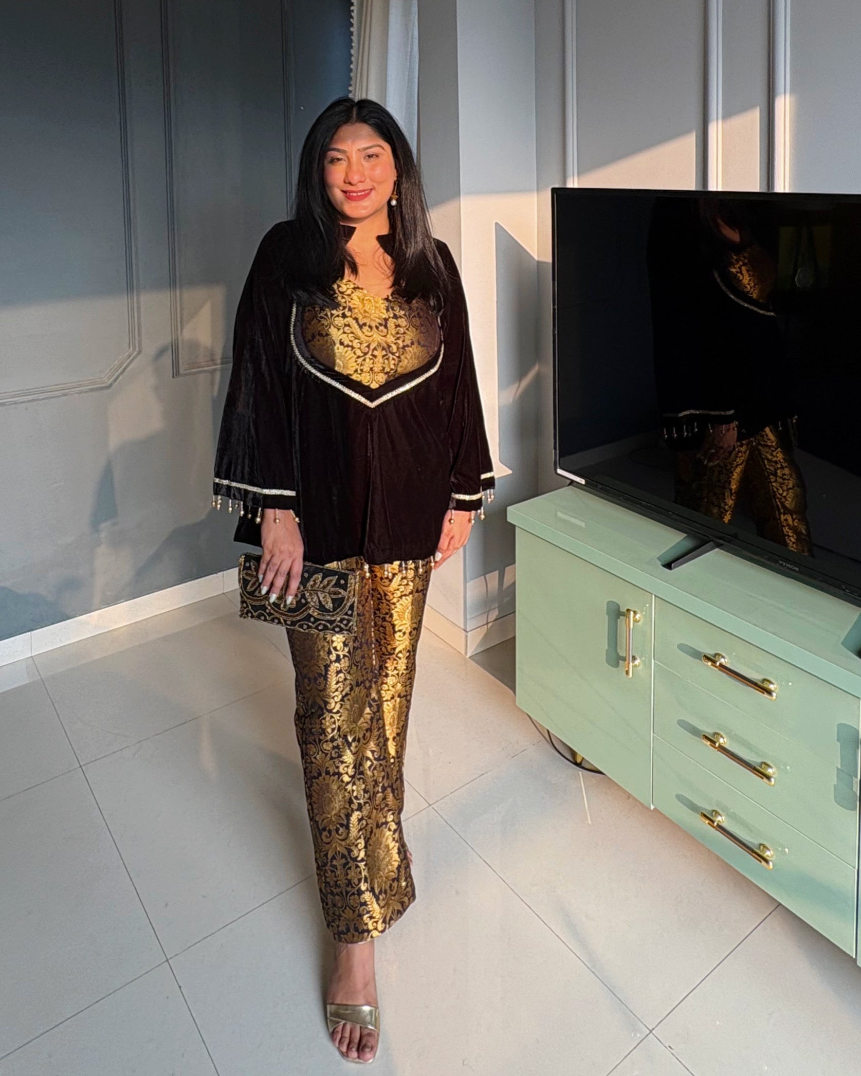 Designed for festive evenings, intimate celebrations, and heritage gatherings, this ensemble is made for women who appreciate craftsmanship, legacy, and understated luxury.