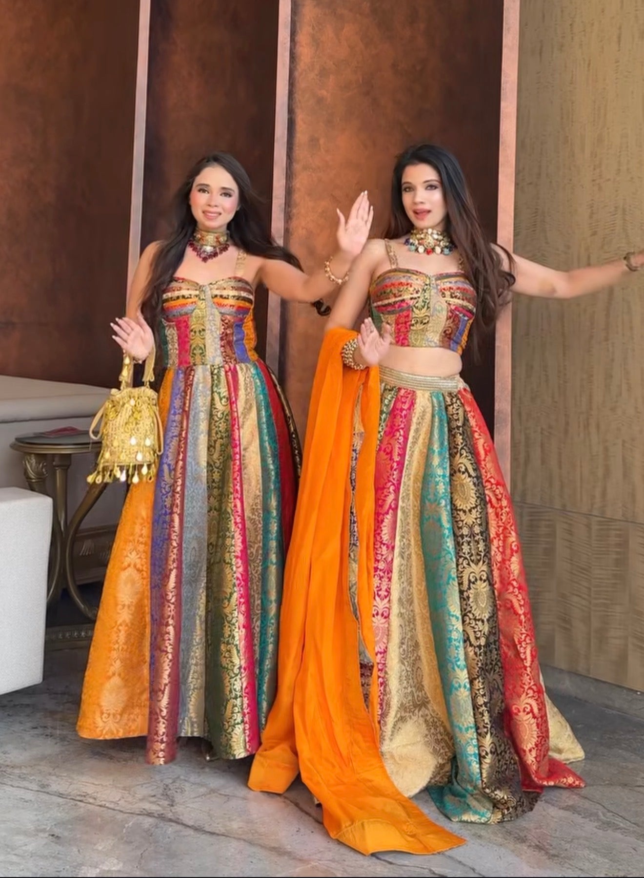 Every panel is intentionally curated and placed — not randomly stitched — creating a seamless balance of colour, texture, and richness. The structured corset-style bodice shapes the upper body beautifully, while the flowy, flared skirt adds movement, elegance, and subtle drama as you walk.