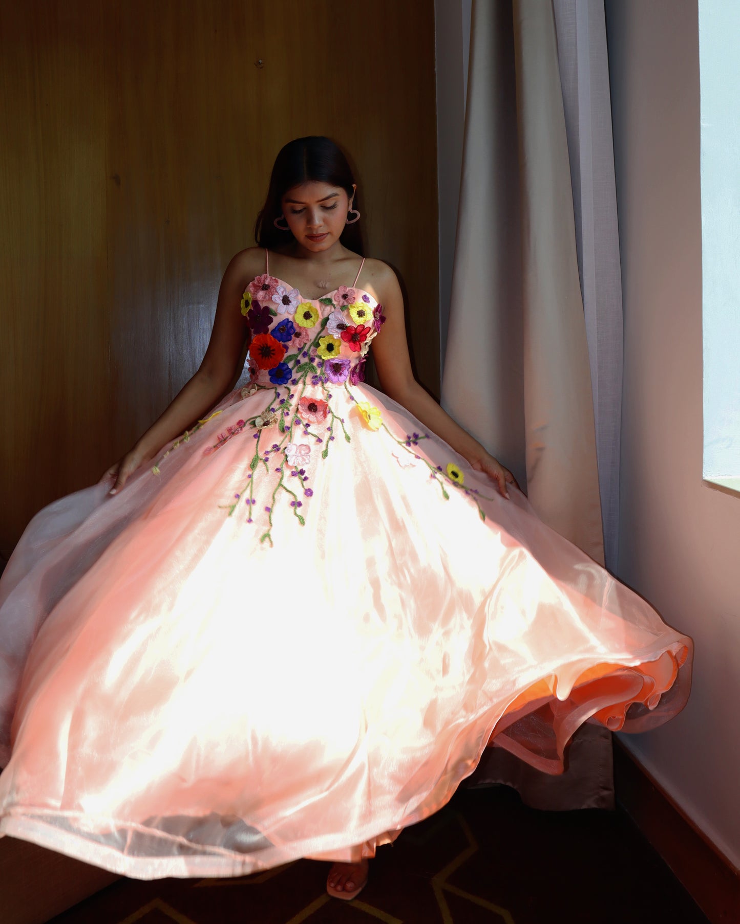Channel the magic of a midsummer garden with our Garden Bloom Gown. This blush-toned organza masterpiece features delicate spaghetti straps, a flattering sweetheart neckline, and a cascade of hand-embroidered 3D flowers that bloom across the bodice and flow into trailing vines. Light, whimsical, and effortlessly feminine—this dress is made for twirling into fairytales and unforgettable evenings.