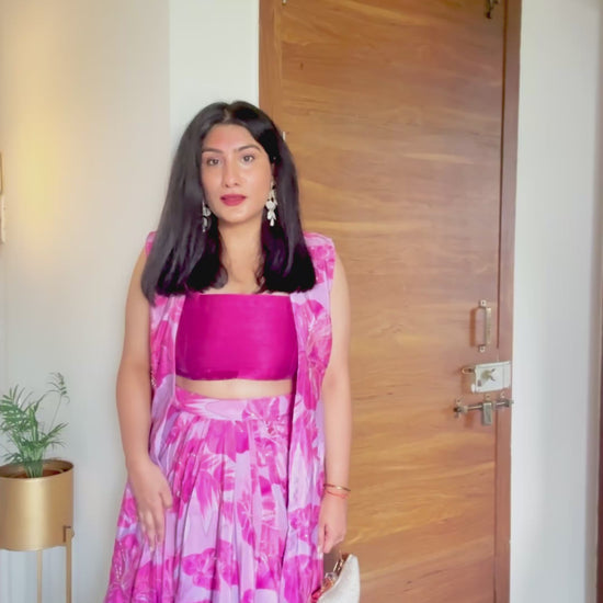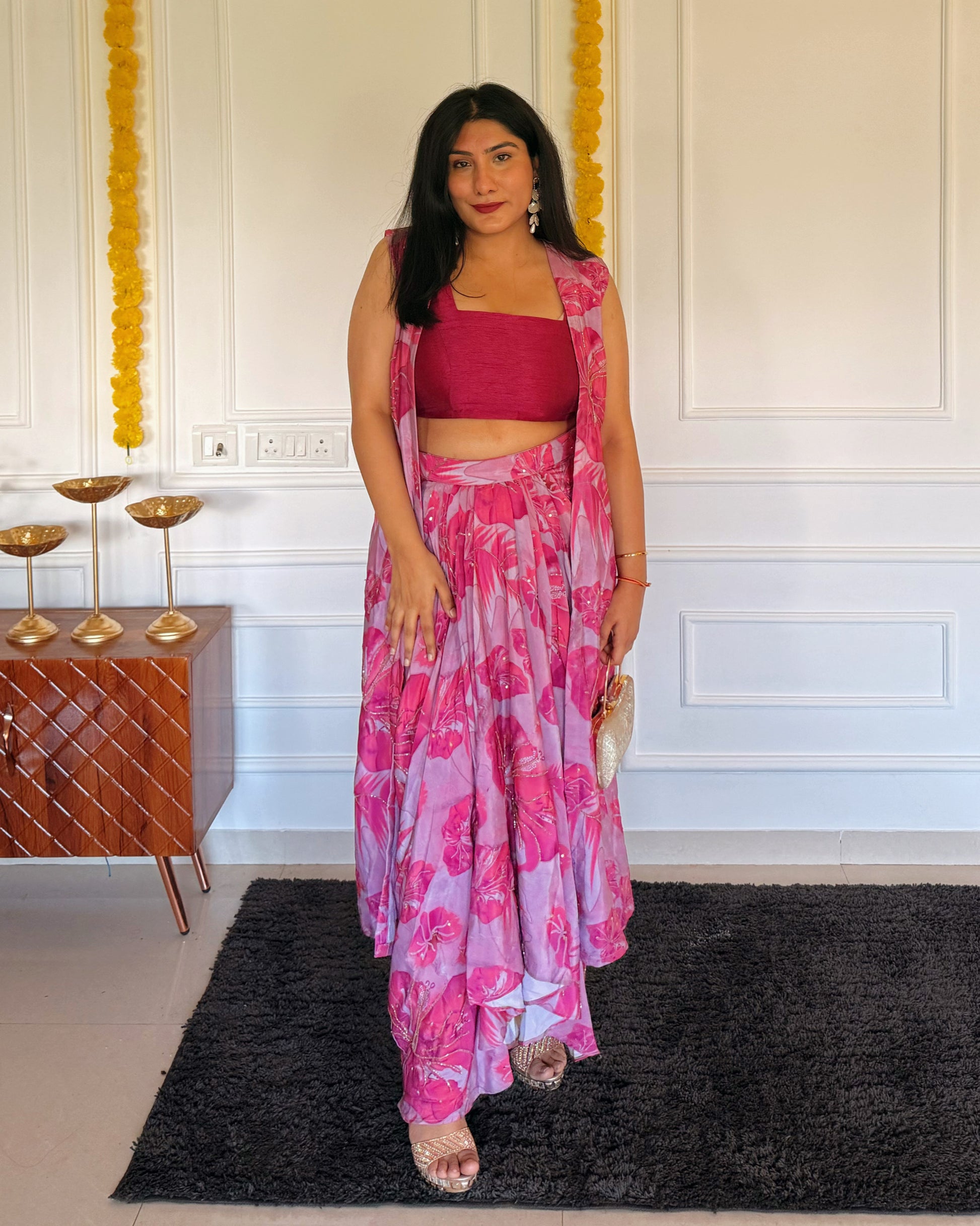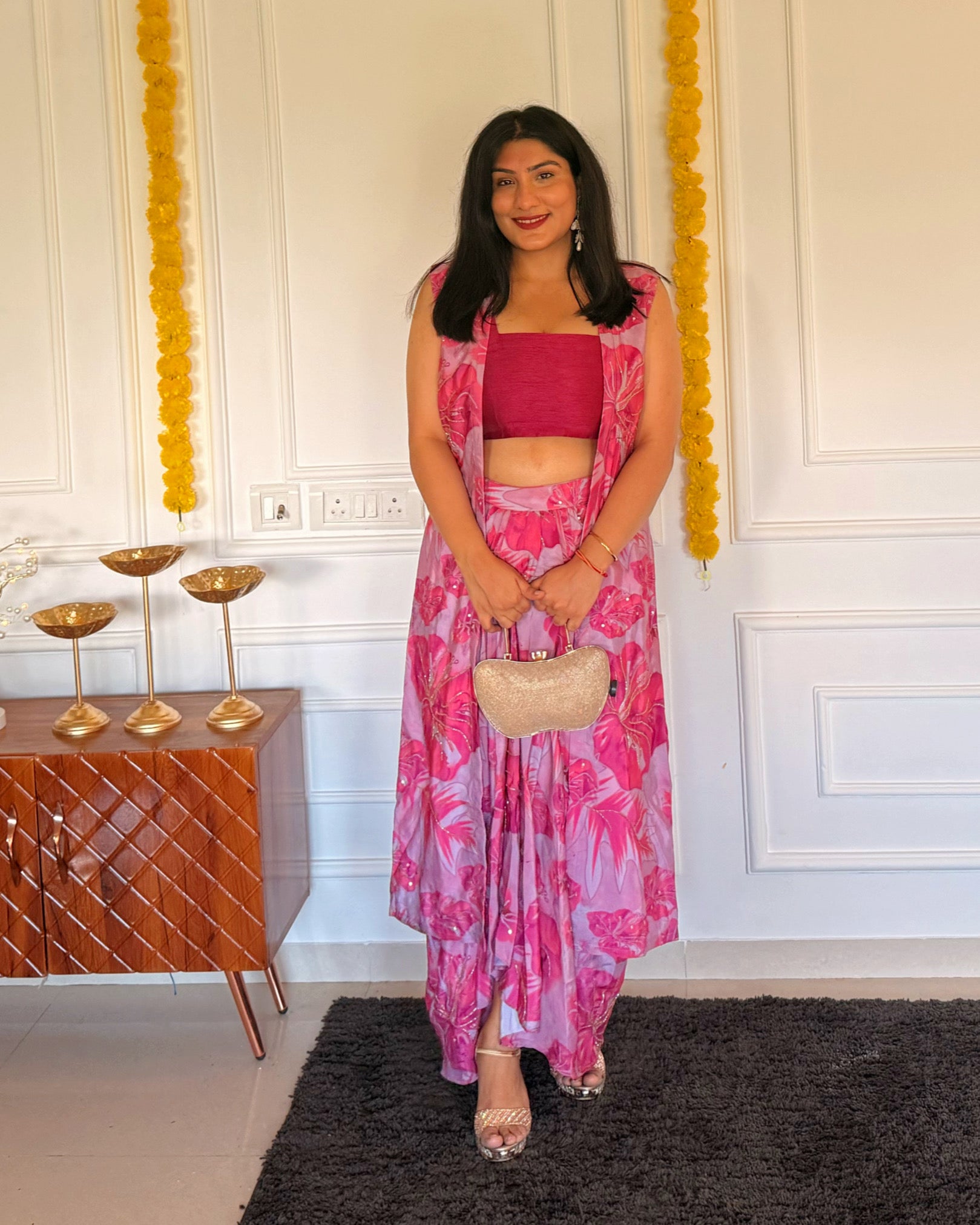 The floral dhoti skirt in shades of lilac and fuchsia is highlighted with subtle hand-embellished bead and sequin detailing, catching the light as you move. Paired with a minimalist structured blouse, the look feels youthful, flattering, and versatile — perfect for day functions, mehendi celebrations, or intimate festive gatherings.