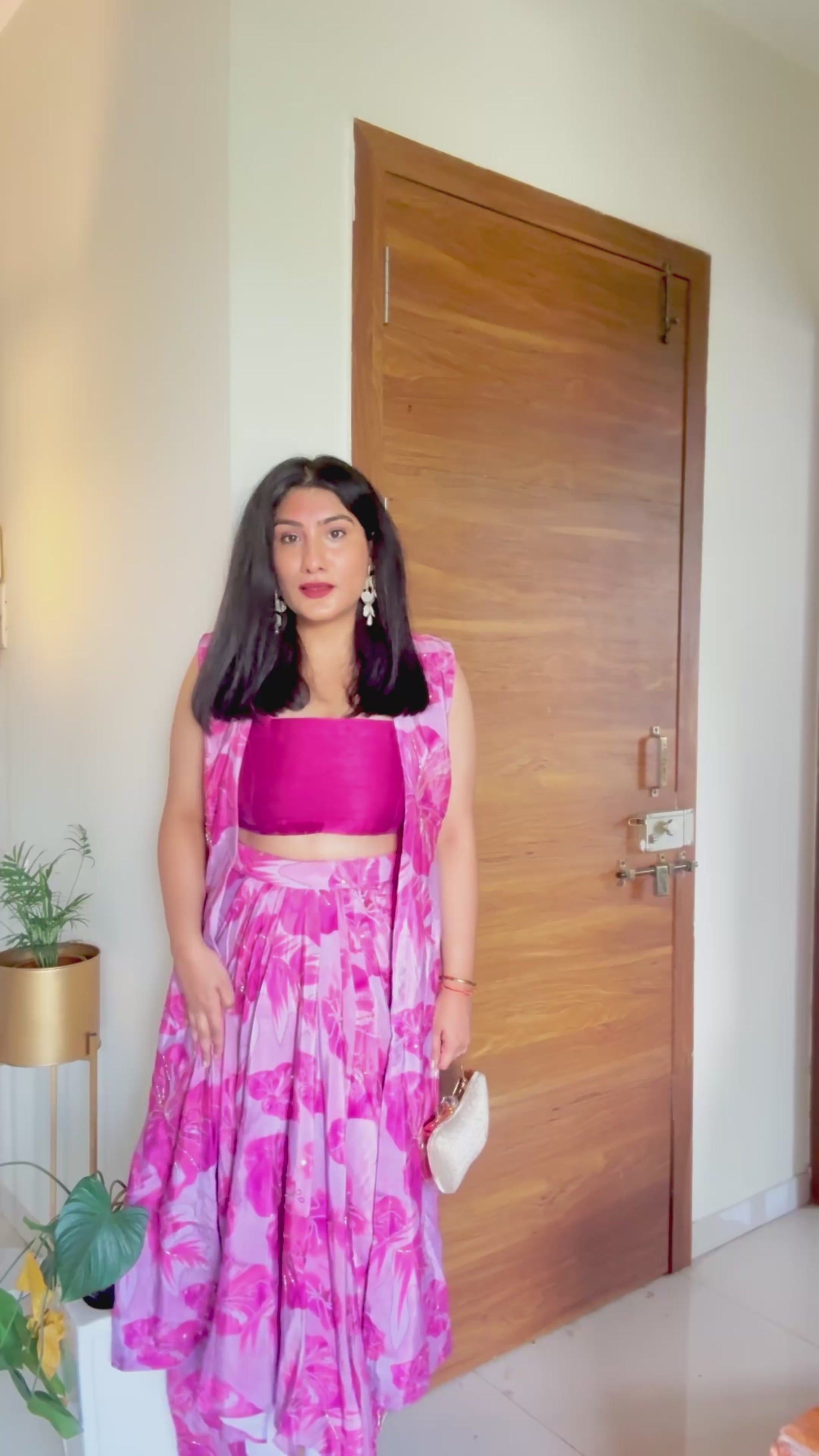 - Bottom: Drape dhoti skirt with floral print, soft pleats, sequin highlights