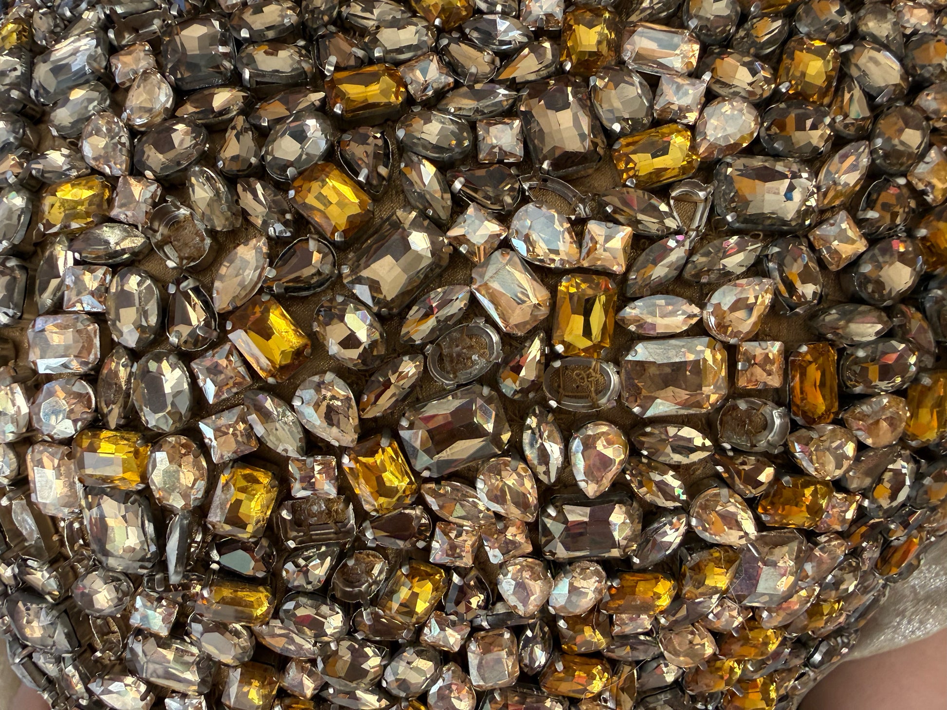 Encrusted with premium gold, champagne, and amber stones that catch every light. Structured fit, secure, and sculpting. -